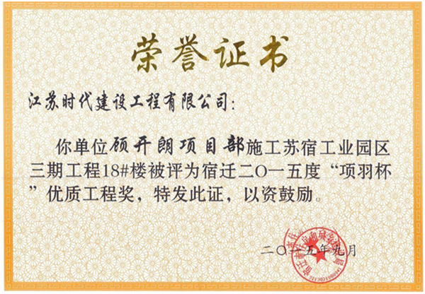 近日,蘇宿園區(qū)公舍三期18#白領公寓工程被宿遷市住房和城鄉(xiāng)建設局授予“項羽杯”優(yōu)質工程獎。