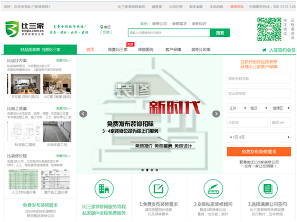 比三家裝修網(wǎng)于2015年10月份落戶蘇宿電子商務(wù)產(chǎn)業(yè)園,該裝修網(wǎng)定位于“互聯(lián)網(wǎng)+”大眾創(chuàng)業(yè)平臺,是一家扎根于三線城市,以“中介生意”模式幫助傳統(tǒng)的裝修行業(yè)的公司利用互聯(lián)網(wǎng)接到更多的訂單,幫助用戶找到合適的裝修公司。網(wǎng)站通過好品質(zhì)裝修,比設(shè)計方案、比施工質(zhì)量、比裝修價格,為用戶提供符合比三家裝修網(wǎng)標(biāo)準(zhǔn)的服務(wù)。