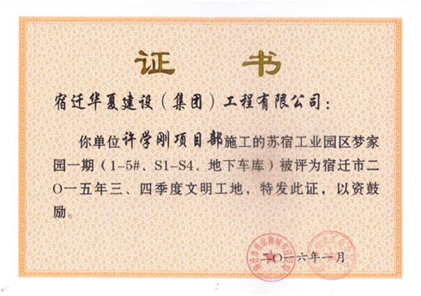 近日,蘇宿工業(yè)園區(qū)夢(mèng)家園一期工程被評(píng)為宿遷市2015年度三、四季度文明工地。