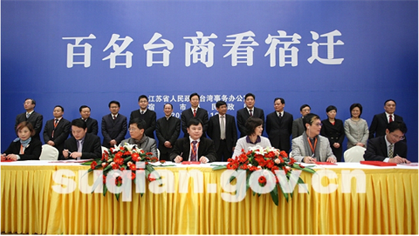 在宿遷投資環(huán)境推介會(huì)上還隆重舉行了項(xiàng)目簽約儀式。經(jīng)過(guò)前期深入溝通和洽談,此次“百名臺(tái)商看宿遷”活動(dòng)取得了一批可喜的項(xiàng)目合作成果,宿豫區(qū)、宿城區(qū)、宿遷經(jīng)濟(jì)開(kāi)發(fā)區(qū)和市有關(guān)部門(mén)與臺(tái)灣島內(nèi)企業(yè)共達(dá)成13個(gè)項(xiàng)目投資意向,協(xié)議總投資達(dá)114.4億元,涉及新能源、新材料、軟件服務(wù)外包、機(jī)械制造、環(huán)??萍肌㈦娮?、食品等多個(gè)領(lǐng)域。