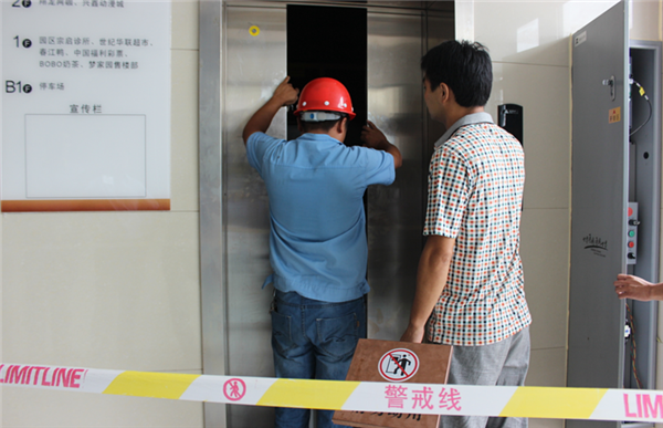 本次演練模擬在西楚金地突發(fā)的一起電梯故障困人事件而展開的應(yīng)急救援。上午9時30分,兩名乘客乘坐西楚金地1號電梯升至4層時突然遭遇電梯停電,乘客緊急按動報警按鈕,語音向中控室反映電梯突然停梯,梯內(nèi)被困乘客兩名。中控室接到報警后,立即啟動電梯故障困人應(yīng)急救援預(yù)案,在安撫乘客的同時,迅速通知工程維修中心及維保單位。相關(guān)人員迅速兵分兩路,一路到電梯機(jī)房準(zhǔn)備盤車,平層施救;另一路到救援樓層4層準(zhǔn)備手動打開廳門,營救轎廂內(nèi)被困乘客。從接到報警求助到救援結(jié)束,整個救援工作不到8分鐘即告成功。